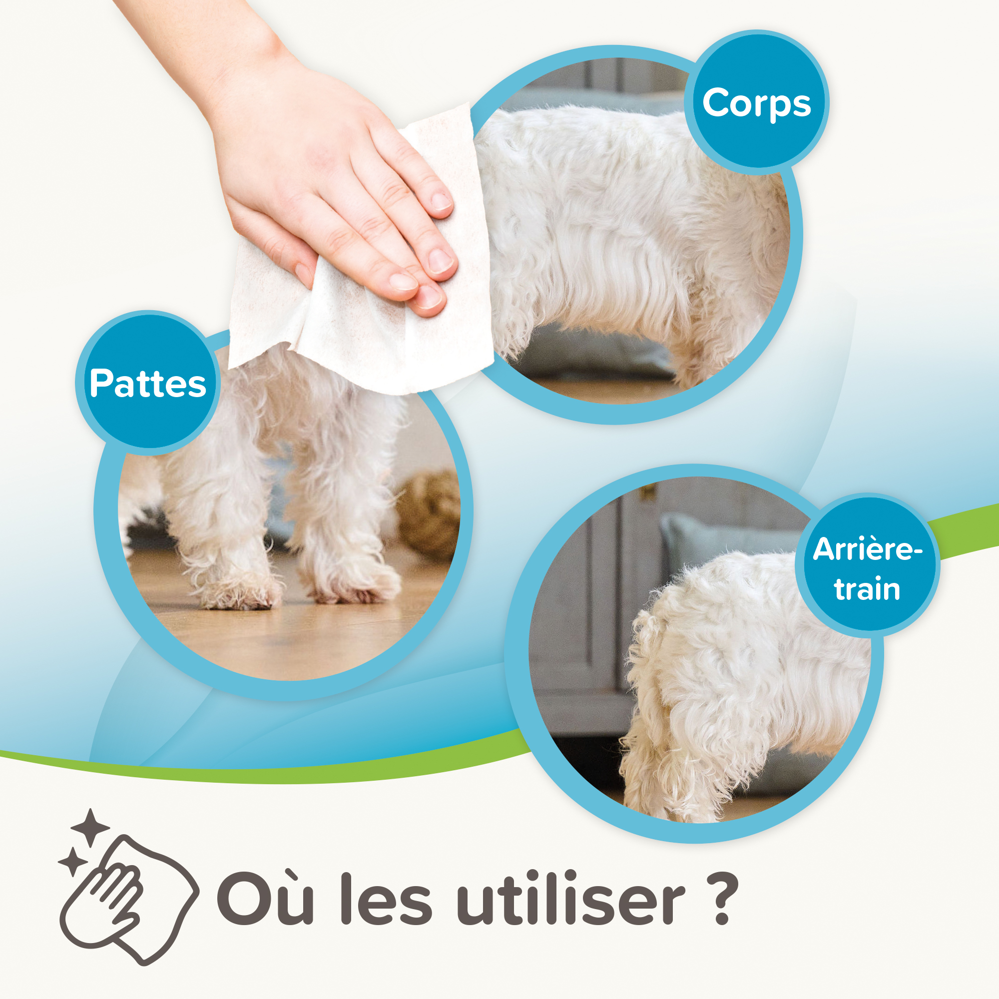 Il est recommandé d'utiliser une nouvelle lingette pour chaque zone à nettoyer afin d'éviter la propagation de bactéries. En cas d'irritation, cessez l'utilisation et consultez un vétérinaire.